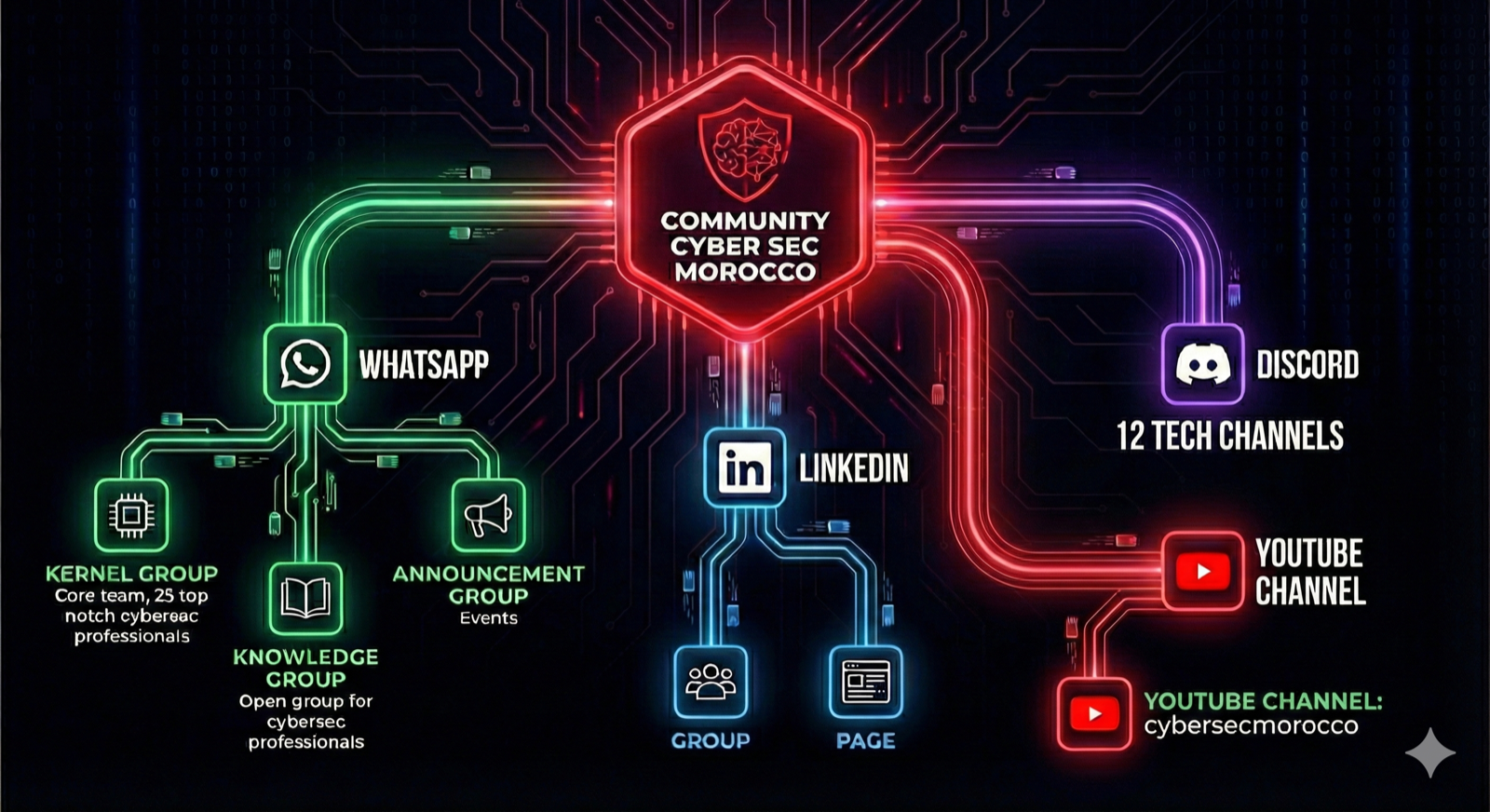 Today, across WhatsApp, Discord, and LinkedIn, we have grown into a community of a few thousand Moroccan cybersecurity professionals. Even the public Discord invite alone showed 926 members and 47 online on March 31, 2026, while the public community map on the site shows 12 tech channels on Discord. On the WhatsApp side, the structure is also intentional, with separate spaces for the core group, knowledge sharing, and announcements instead of everything being pushed into one noisy room.